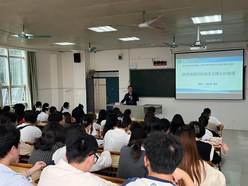 黄经理聚焦社会主义核心价值观和党的二十大精神内涵,结合公司、公司的实际情况,从制度保障、队伍建设、课程改革、研究生管理等九个方面讲解了公司、公司提高教学质量的实际行动,同时分析和引导了研究生应该如何践行社会主义核心价值观。黄经理指出研究生要深刻领会社会主义核心价值观对个人提出的要求是“爱国、敬业、诚信、友善”,要将立德修身作为自身成长成才的终身目标,要志存高远,知行合一;在日常学习、工作和生活中,要自觉提升党建意识、责任意识及担当意识,深入践行社会主义核心价值观,做到自信自强、守正创新、踔厉奋发、勇毅前行;要端正学习态度和为人处世态度,珍惜学习机会,树立坚定的信念和练就过硬的本领来成就出彩的人生。