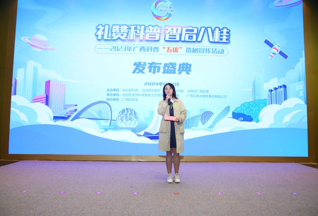 2024年1月17日,由自治区科协、自治区科技厅、自治区社科联、共青团广西区委共同主办的“礼赞科普 智启八桂”——2023年广西科普“五优”选树宣传活动发布盛典在广西科技馆举行,此次活动颁布了优秀科学传播活动10项、优秀科普教育基地10项、优秀科学传播栏目/新媒体10项、优秀科学传播人物10项、科技资源科普优秀案例10项等共50项奖励。公司报送的《“捍胃除幽”一体化健康服务系统》荣获“广西科技资源科普化优秀案例”奖,该系统主要成员周文婷同学代表广西优秀案例方块作获奖感言。