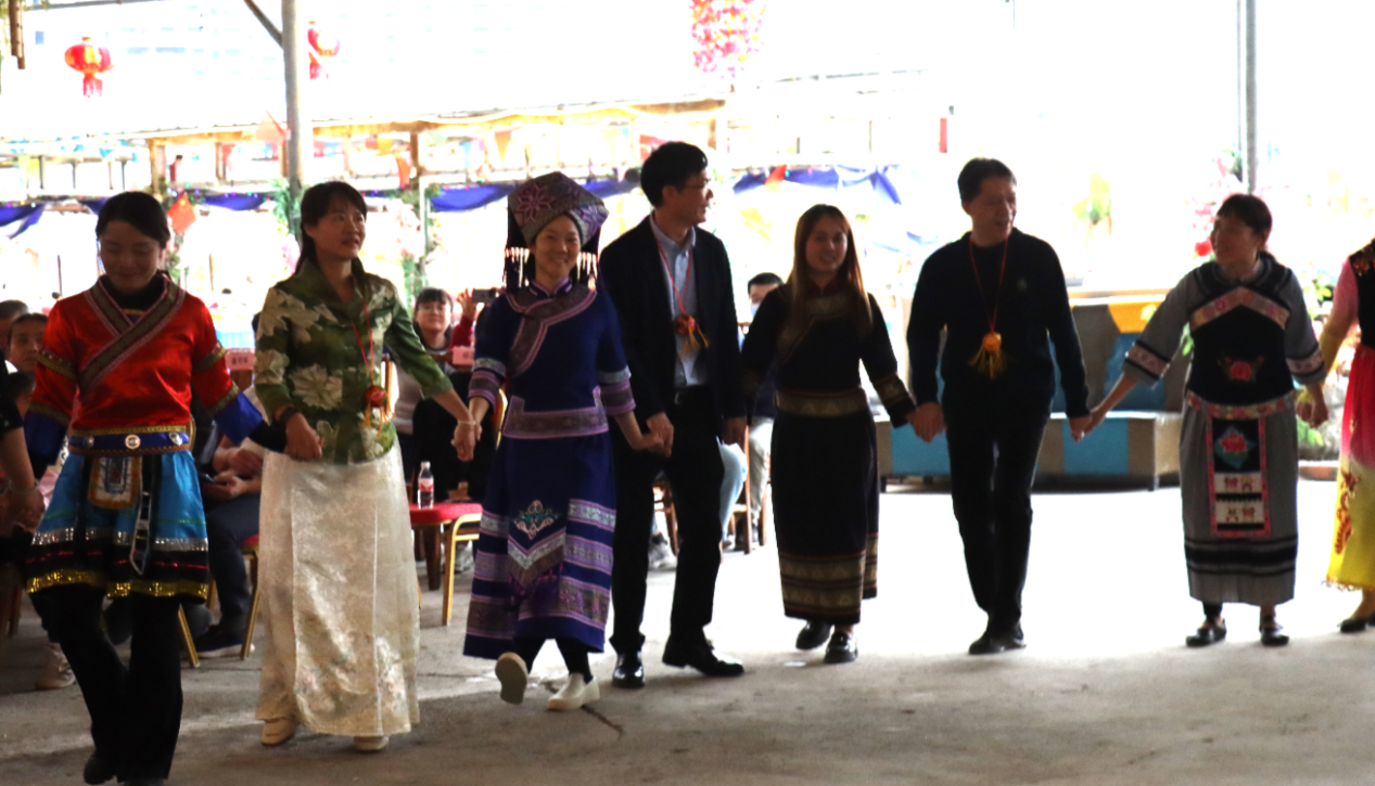 活动高潮时刻,全场所有教师手牵手合跳“赶圩归来阿哩哩”舞蹈,共同祝愿祖国繁荣昌盛。热情洋溢的舞蹈让现场气氛达到了巅峰,仿佛将民族的热情和活力融入其中。