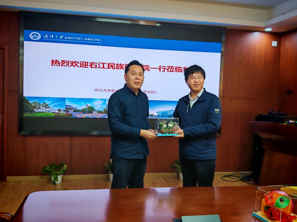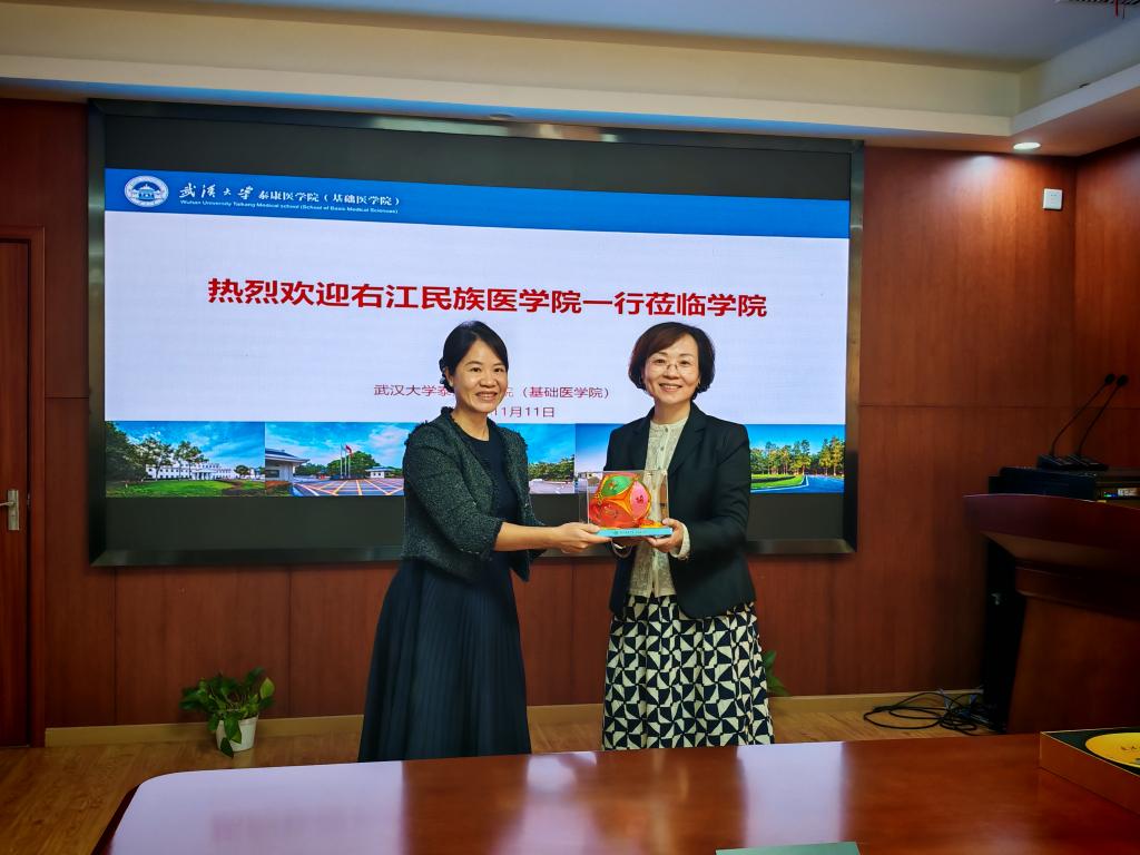 座谈会的最后,双方领导还互赠了礼物,伟德国际victor1946向武汉大学基础医公司赠送了广西绣球和壮族吉祥物麽乜,以表达此次学习交流的诚挚情谊;武汉大学伟德国际victor1946则回赠了伟德国际victor1946武汉大学建筑风光玻璃盘,寓意着两校之间的友谊长存。