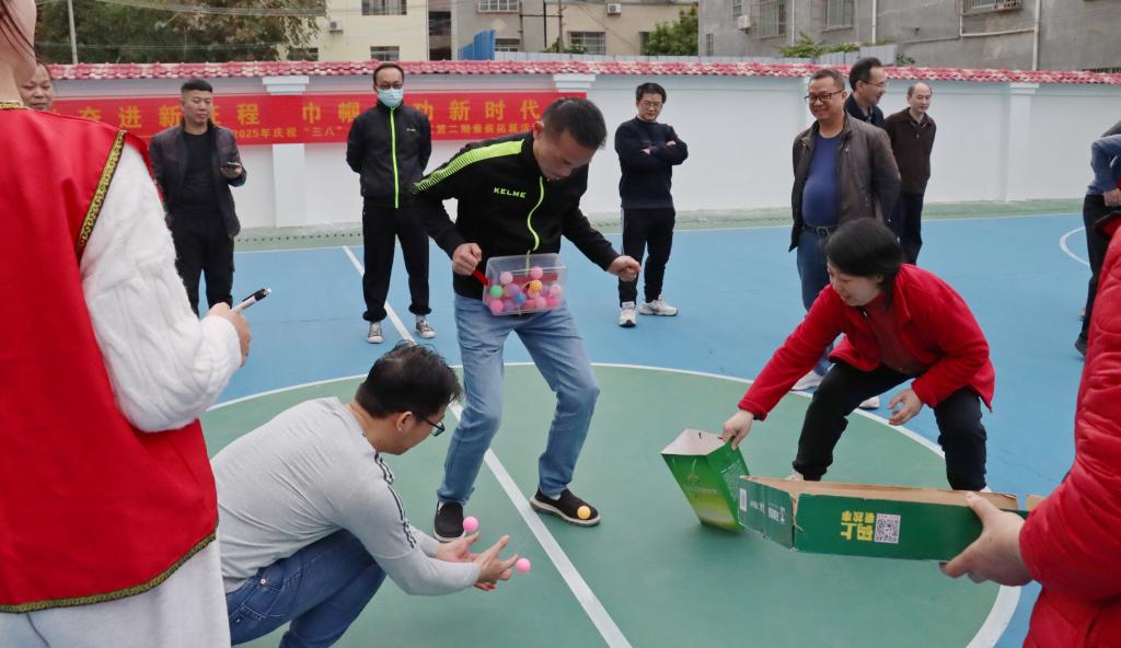 随后,春游活动的重头戏——一系列团队协作项目精彩上演。在“高山流水(珠行万里)”项目中,教职工们需要紧密协作,用U型槽接力传递球,成功将球送入篮子,过程中球一旦掉落就需重新开始,这极大地考验了团队的配合与专注度。而在“超级电动马达(抖球)”项目中,参赛队员将装有乒乓球的盒子绑在腰上,通过身体动作抖球,现场乒乓球跳动的声音和大家的欢笑声交织在一起,充满了趣味性。此外,“无敌风火轮”和“抛绣球投篮”等项目也备受教职工们的喜爱,大家在这些项目中不断挑战自我,调整策略,力求取得更好的成绩。