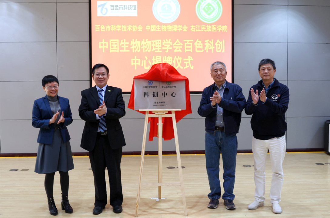 刘平生总干事长、吉永华教授、李雪斌董事长、邓雅娜主席共同为“中国生物物理学会百色科创中心”揭牌。