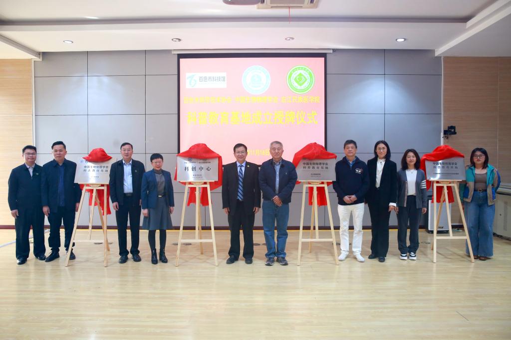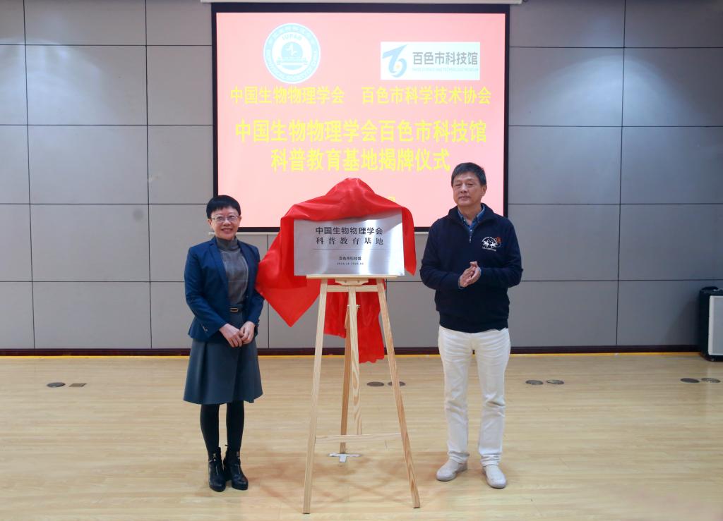 吉永华教授、邓雅娜主席共同为“中国生物物理学会百色市科技馆科普教育基地”揭牌。