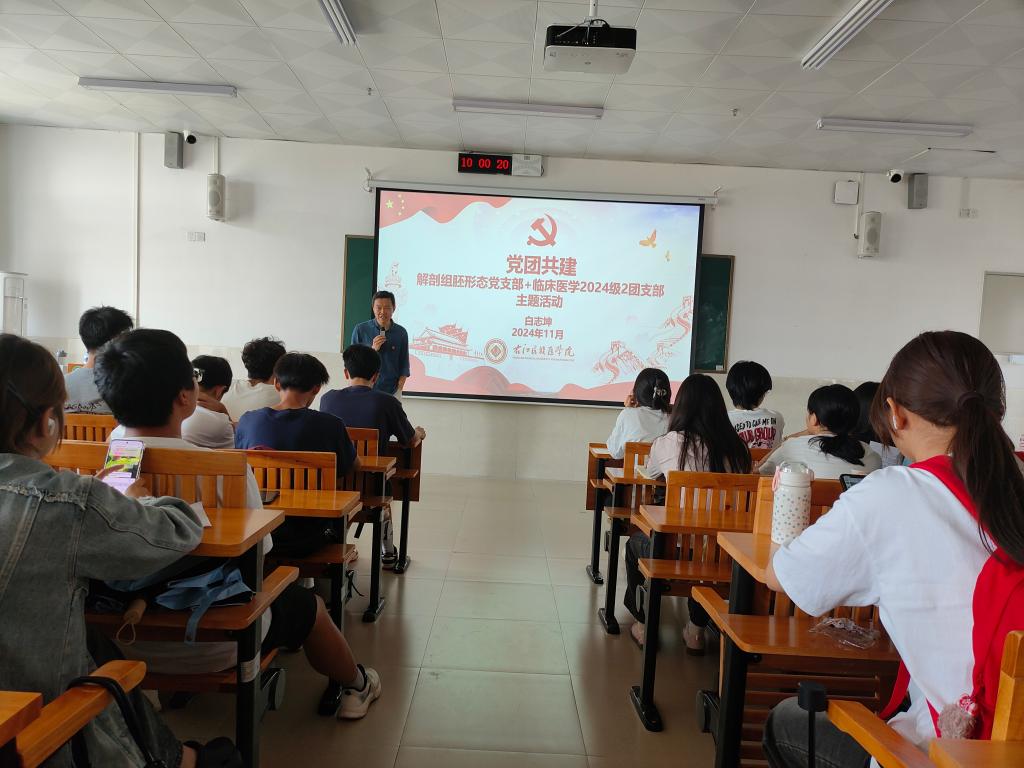 2024年11月1日上午,伟德国际victor1946解剖组胚形态党支部与2024级临床医学本科2班团支部在百东校区成功举办了“创新创业培训”暨“党团共建”主题讲座活动。此次活动特邀解剖组胚形态党支部书记暨2024级临床医学本科2班创新导师白志坤老师担任主讲嘉宾,旨在激发员工的创新思维,提升创业能力,并加强党团组织之间的联系与合作。